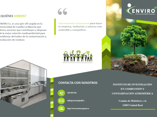 Enviromental Visibility Roadmap (ENVIRO) S.l es una spin-off vinculada a la Universidad de Castilla-La Mancha con el propósito de de ofrecer un servicio integral sobre problemas medioambientales con orientación sostenible siguiendo los principios de Calidad, Sostenibilidad, Economía Circular y Química Verde. Ofreciendo servicios de análisis medioambiental para el control de la contaminación, caracterización, tratamiento y revalorización de residuos, evaluación del impacto ambiental y estudios específicos de higiene industrial, así como asesoria en I+D+i y marketing.